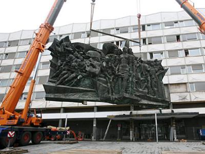 Das 33 Tonnen schwere Marx - Relief mit Namen "Aufbruch" ist heute vom früheren Verwaltungsgebäude der (Karl Marx ) Universität Leipzig abgebaut worden.